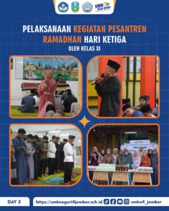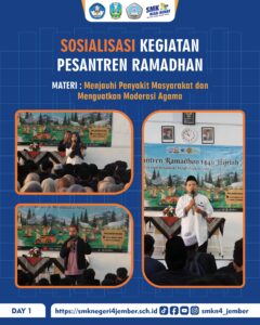 Minggu pertama kegiatan Pesantren Ramadhan di SMKN 4 Jember berlangsung dari Kamis (6/3/2025) hingga Jumat (14/3/2025). Kegiatan ini dipimpin oleh tim guru Pendidikan Agama Islam (PAI) dan dibantu oleh tim OSIS/MPK SMKN 4 Jember. Kegiatan Pesantren Ramadhan 2025 diikuti oleh siswa-siswi kelas X dan XI. Pesantren Ramadhan ini bertujuan untuk meningkatkan pemahaman agama serta membentuk karakter yang lebih baik bagi siswa.