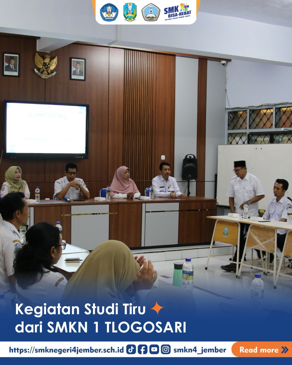 Jember — SMKN 4 Jember menerima kunjungan study tiru dari SMKN 1 Tlogosari Bondowoso, khususnya dari Konsentrasi Keahlian Bisnis Retail. Acara yang digelar di Vocational Hall sejak pukul 10.00 WIB ini diawali dengan pemutaran berbagai video proyek siswa sebagai pengenalan singkat terhadap jurusan-jurusan unggulan di SMKN 4 Jember. Tak hanya sebagai study tiru, kunjungan ini juga menjadi sumber inspirasi untuk pengembangan program keahlian sejenis di sekolah asal mereka. (11/06/25)