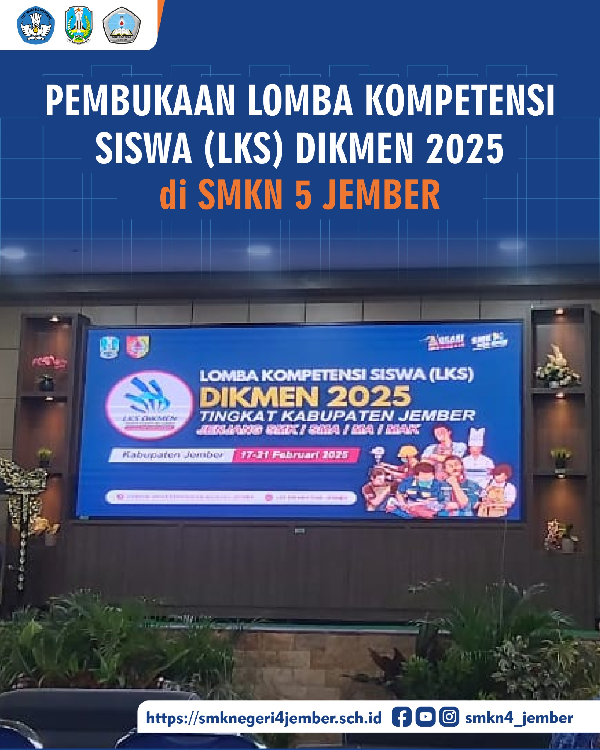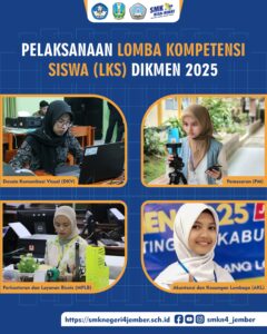 Hari pertama Lomba Kompetensi Siswa (LKS) tingkat Kabupaten Jember telah dimulai pada hari ini (18/02/2025). Lomba yang berlangsung di antaranya yaitu bidang Artificial Intelligence, Fashion Technology, Fishery, Graphic Design Technology, Marketing Online, Health & Social Care, Food Technology, IT NSA, Tourism Industry, dan Web Technologies. Lokasi lomba-Lomba tersebut tersebar di beberapa SMK di Kab. Jember. SMKN 4 Jember ikut serta dalam bidang Graphic Design Technology yang diwakili oleh jurusan Desain Komunikasi Visual (DKV) dan bidang Marketing online yang diwakili oleh jurusan Pemasaran (PM). Selain itu, SMKN 4 Jember juga mengirimkan perwakilan sekaligus menjadi tuan rumah untuk Lomba Billingual Secretary dari jurusan Managemen Perkantoran dan Layanan Bisnis (MPLB) dan lomba Accounting dari jurusan Akuntansi.
