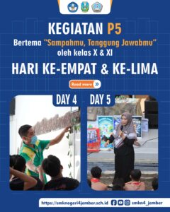 Sebagai penutup, pada hari Jumat (14/02/2025), diadakan bakti sosial dimana hasil penjualan sampah yang telah dikumpulkan disumbangkan kepada murid yang membutuhkan. Acara kemudian ditutup dengan penampilan hiburan dari ekstrakurikuler band SMKN 4 Jember, menciptakan suasana penuh kebersamaan dan semangat kepedulian lingkungan.(@JurnalistikSmepa) – GuLa & Ivy’z