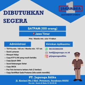 Dibutuhkan Segera SATPAM (100 Orang) Kualifikasi; Pria/Wanita minimal usia 19 Tahun Tinggi badan pria minimal 168 cm/Wanita minimal 157 cm Surat lamaran Riwayat hidup Copy KTP dan KK yang masih berlaku Copy ijazah SMA Surat keterangan sehat Copy SKCK Pas foto berwarna terbaru 4×6 (2 lembar) Copy sertifikat Gada Pratama (bila sudah memiliki)