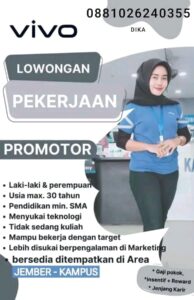 VIVO PROMOTOR Kualifikasi; Laki-laki dan Perempuan Usia maksimal 30 Tahun Pendidikan minimal SMA Menyukai teknologi Tidak sedang kuliah Mampu bekerja dengan target Lebih disukai berpengalaman di Marketing Bersedia ditempatkan di Area Jember-Kampus Fasilitas; Gaji pokok Insentif + Reward Jenjang Karir ⚠️PERHATIAN⚠️ Budayakan membaca!!! Hati-hati penipuan (jangan pernah transfer uang). Cek tanggal, lokasi, sebelum mengajukan. Lowongan […]