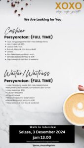XOXO (shop cafe gelato) Cashier Persyaratan (Full Time) jujur, tanggung jawab dan mau bekerja keras usia maksimal 30 tahun lulusan SMK/SMA ramah, menarik dan komunikatif cewek bisa bekerjasama dalam team bersedia bekerja lembur dan shift siap bekerja di hari libur dan weekend Waiter/Waiterss Persyaratan (Full Time) jujur, tanggung jawab dan mau bekerja keras berpenampilan menarik, […]