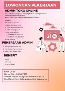 Toko B3fashion bergerak dibidang fashion sedang membuka lowongan pekerjaan sebagai admin toko online dengan syarat sebagai berikut; Wanita Maksimal umur 29 tahun Ijazah SMP atau SMA Jujur, teliti, dan percaya diri Tidak sedang kuliah Bisa bekerja shift Pagi 08.00-16.00 Malam 15.00-23.00 Niat bekerja Pekerjaan Admin Rekap orderan saat live Membalas chat customer Kerja 8 jam […]