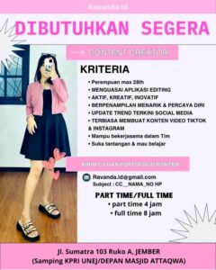 Kriteria; Perempuan maksimal 28 tahun Menguasai aplikasi editing Aktif, kreatif dan inovatif Berpenampilan menarik dan percaya diri Upadate trend terkini sosial media Terbiasa membuat konten video tiktok dan instagram Mampu bekerjasama dalam tim Suka tantangan dan mau belajar Kirim CV dan Portofolio konten ke; Ravanda.id@gmail.com Subject; CC_NAMA_NO HP Part Time/Full Time – Part Time 4 […]