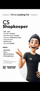 Kualifikasi; Laki-laki Umur 20-25 tahun Bertempat tinggal di Jember Mempunyai pengalaman kerja lebih diutamakan Full time job Ditutup 2 Juli 2025 Benefit; Gaji pokok Bonus BPJS Kesehatan dan Ketenagakerjaan Send your CV ke; hiring@notosportswear.com Subject CS Shopkeeper