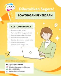 Kualifikasi; Wanita usia maksimal 30 Tahun Rajin, jujur dan bertanggung jawab Bisa mengoperasikan komputer Pendidikan minimal SMK/SMA Cekatan dan mampu berpikir kritis Mimiliki kemampuan berkomunikasi dengan baik Kirimkan CV dan lamaran kerja ke CV Jaya Cipta Prima Jl. Letjen Suprapto No. 3 Jember 0821-4305-9663 jayajember@yahoo.com