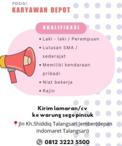 Kualifikasi; Laki-laki / perempuan Lulusan SMA sederajat Memiliki kendaraan pribadi Niat bekerja Rajin Kirim CV/lamaran ke; Warung Sego Pincuk Jl. Kh. Shiddiq Talangsari Jember (Depan Indomaret Talangsari) 0812 3223 5500
