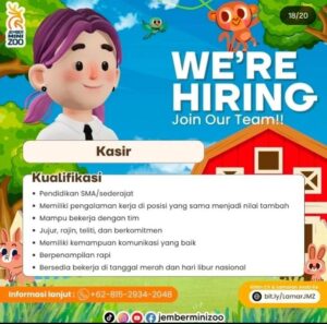 Kualifikasi; Pendidikan SMA sederajat Memiliki pengalaman kerja diposisi yang sama menjadi nilai tambah Mampu bekerja dengan tim Jujur, rajin, teliti dan berkomitmen Memiliki kemampuan komunikasi yang baik Berpenampilan rapi Bersedia bekerja di tanggal merah dan hari libur nasional Kirim CV dan lamaran anda ke; bit.ly/LamarJMZ Informasi lanjut; WA: 0815-2934-2048