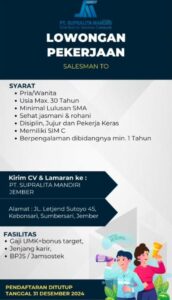 Lowongan Kerja Salesman To di PT. Supralita Mandiri Jember.