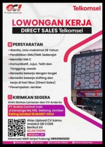 PT. Graha Central Indo membuka lowongan pekerjaan sebagai : Direct Sales Telkomsel dengan Kualifikasi sebagai berikut : Wanita, usia max 28 tahun Pendidikan SMA sederajat Memiliki SIM C Komunikatif, jujur, teliti, dan tanggungjawab Bersedia bekerja dengan target Bersedia bekerja dengan sistem shift Penempatan Jember Kirim berkas lamara dan CV ke : PT. Graha Central Indo […]