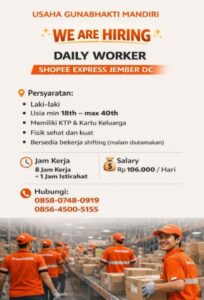 Lowongan Pekerjaan Usaha Gunabhakti Mandiri Daily Worker Shopee Express Jember DC Persyaratan terlampir