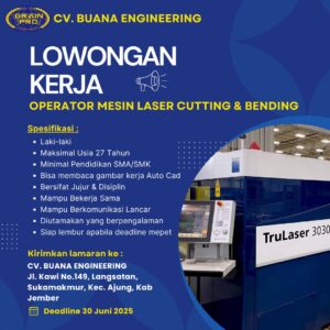Spesifikasi; Laki-laki Maksimal usia 27 tahun Minimal pendidikan SMA/SMK Bisa membaca gambar kerja Auto Cad Bersifat jujur dan disiplin Mampu bekerja sama Mampu berkomunikasi lancar Diutamakan yang berpengalaman Siap lembur apabila deadline mepet Kirimkan lamaran ke; CV. Buana Engineering Jl. Kawi No. 149, Langsatan Sukamakmur Ajung Jember Deadline 30 Juni 2025