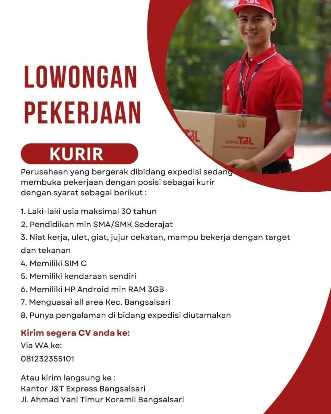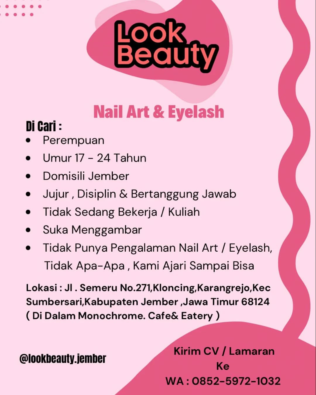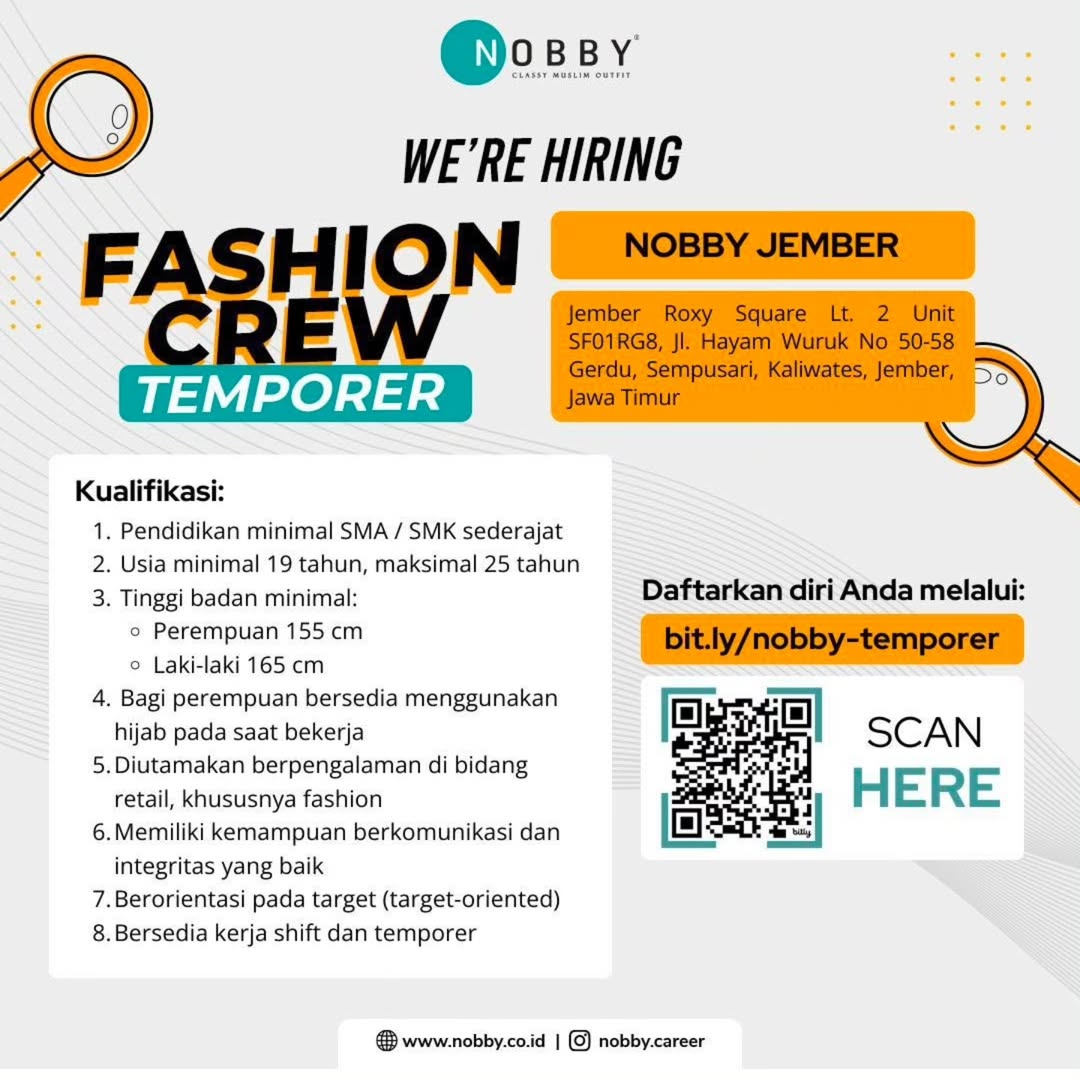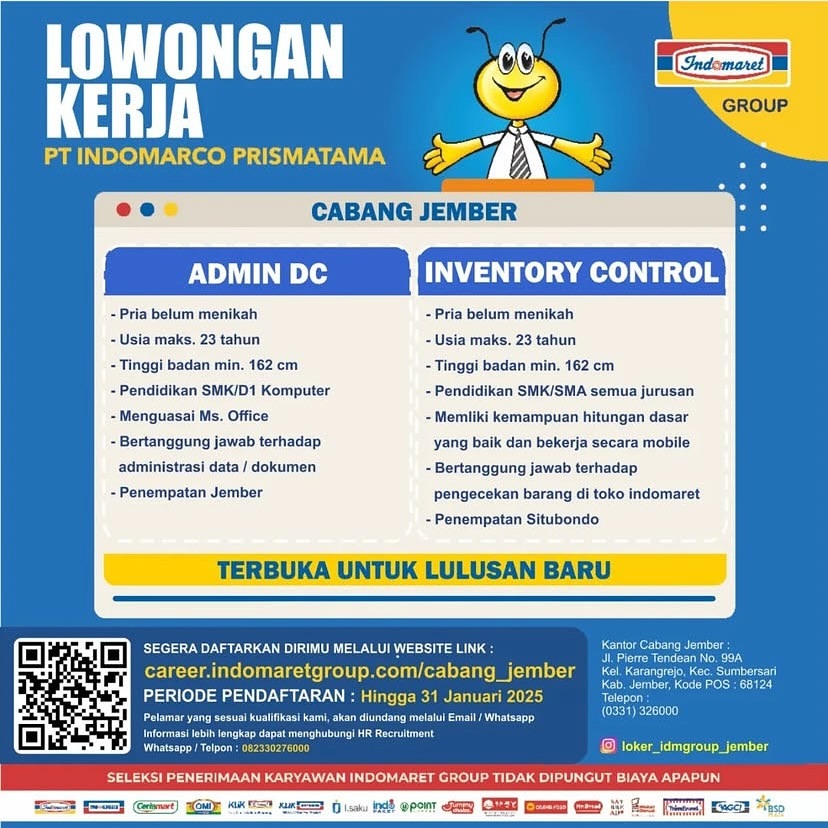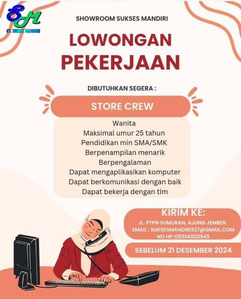 Store Crew Kualifikasi; Wanita Maksimal umur 25 Tahun Pendidikan minimal SMA/SMK Berpenampilan menarik Berpengalaman Dapat mengaplikasikan komputer Dapat berkomunikasi dengan baik Dapat bekerja dengan tim Kirim ke; Jl. PTPN Sumuran, Ajung Jember Email; suksesmandiri327@gmail.com No. HP 085141021945 Sebelum 21 Desember 2024