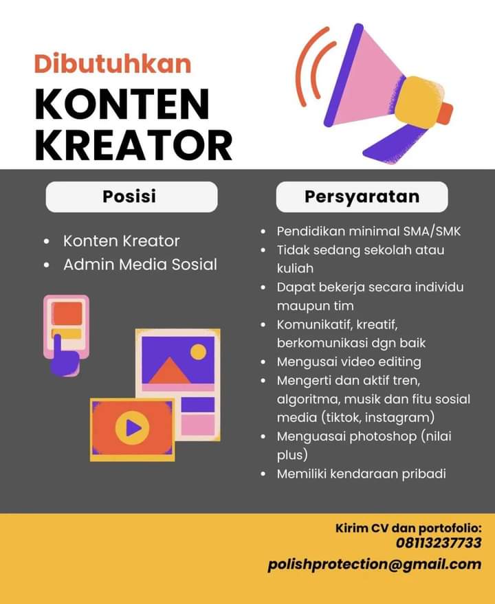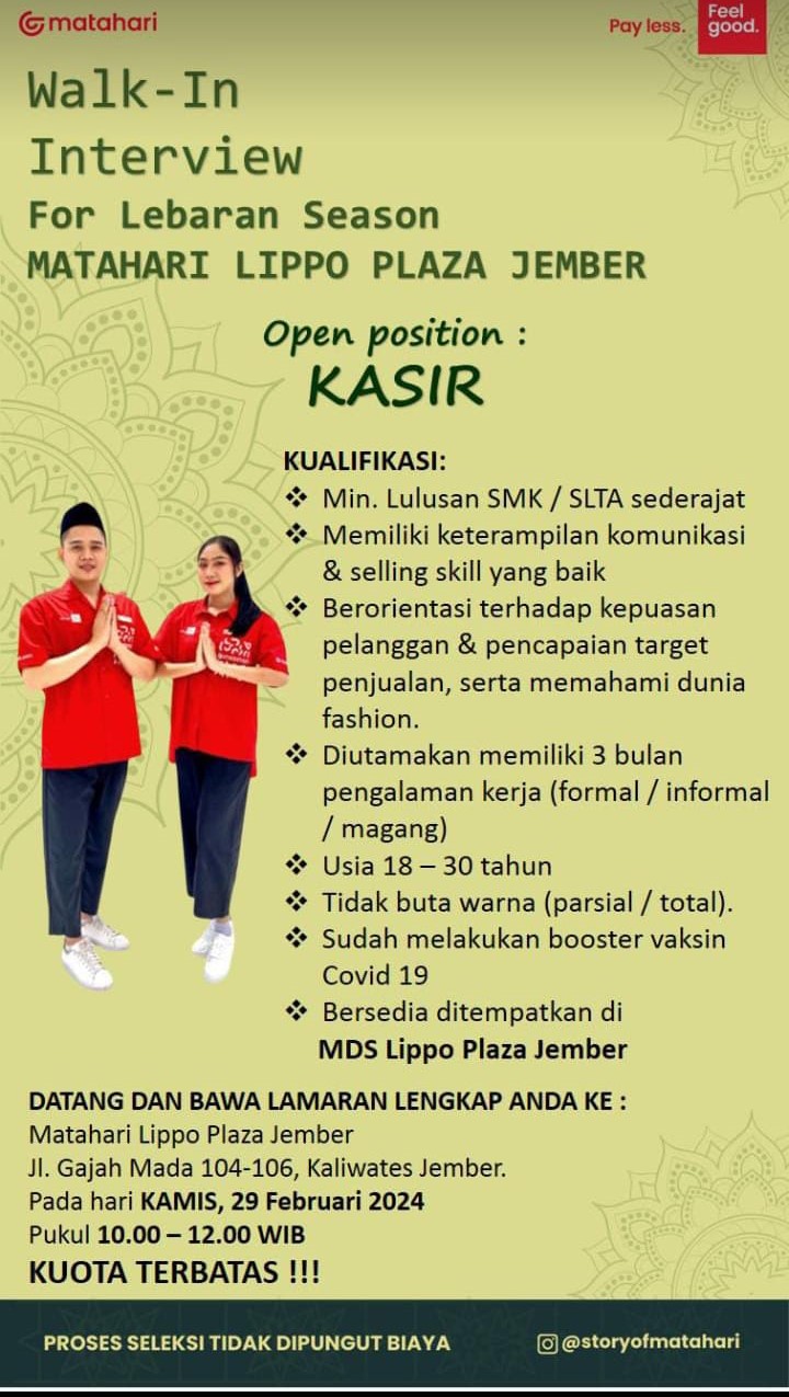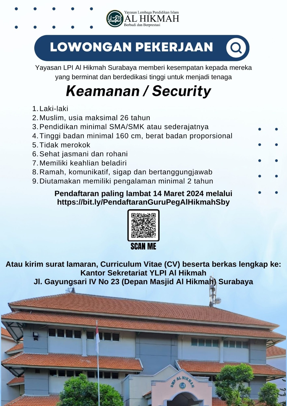 Lowongan Kerja Security/Keamanan Laki – Laki Muslim, usia maksimal 26 tahun Pendidikan minimal SMA/SMK atau sederajatnya Tinggi badan minimal 160 cm, berat proposional Tidak merokok Sehat jasmani dan rohani Memiliki Keahlian beladiri Ramah, komunitif, sigap dan bertanggung jawab Diutamakan memiliki pengalaman minimal 2 Tahun Pendaftaran paling lambat 14 Maret 2024 melalui : https://bit.ly/PendaftaranGuruPegAlHikmahSby atau kirim […]