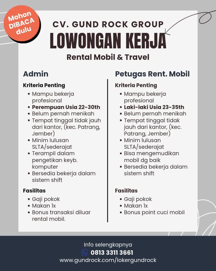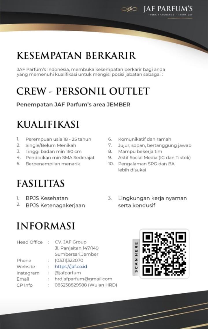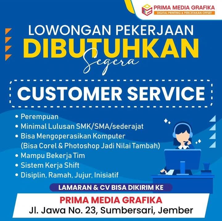 Kualifikasi; Perempuan Minimal lulusan SMK/SMA sederajat Bisa mengoperasikan komputer (bisa Corel dan photoshop jadi nilai tambah) Mampu bekerja tim Sistem kerja shift Disiplin, ramah, jujur dan inisiatif Kirim CV dan lamaran ke; PRIMA MEDIA GRAFIKA Jl. Jawa no. 23 Sumbersari-Jember