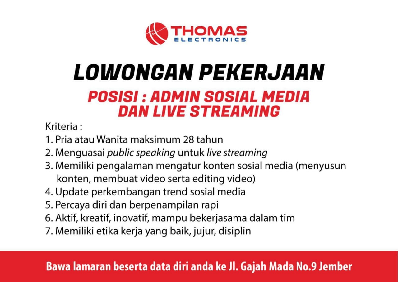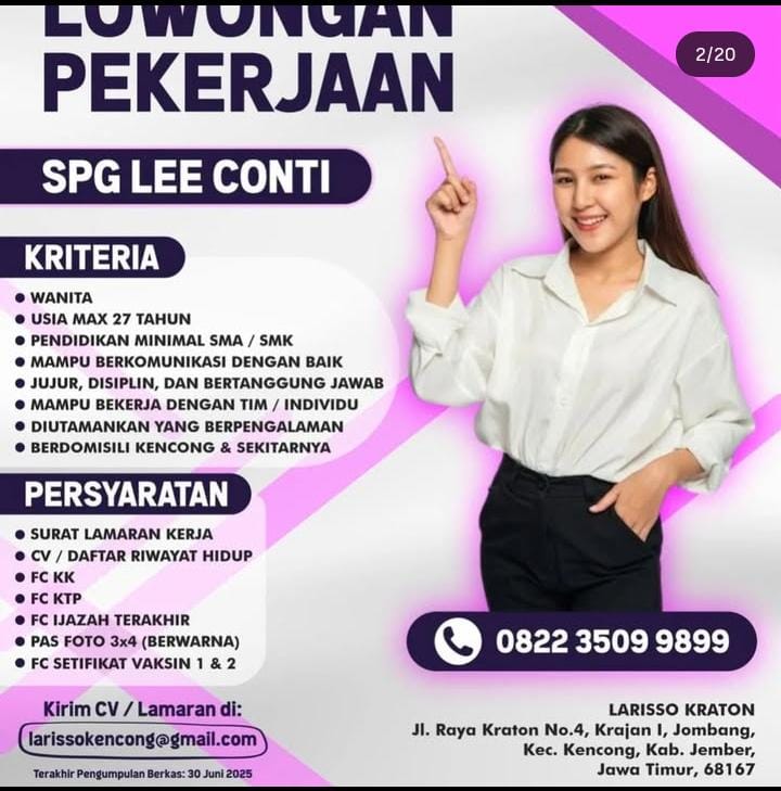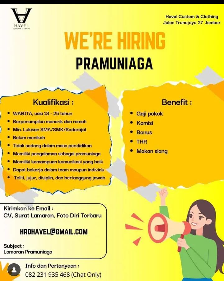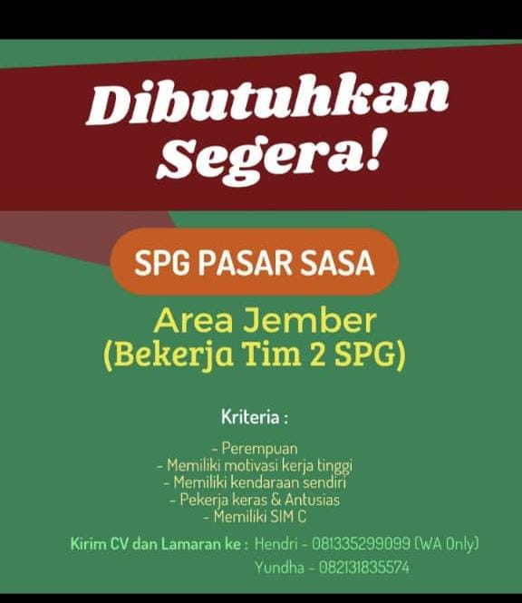 Kualifikasi; Pendidikan SMA/sederajat Memiliki pengalaman kerja/magang di posisi yang sama menjadi nilai tambah Mampu bekerja dengan tim Jujur, rajin dan berkomitmen Memiliki kemampuan komunikasi yang baik Berpenampilan rapi Bersedia bekerja di tanggal merah dan hari libur nasional Kirim CV dan lamaran anda ke; bit.ly/LamarJMZ Informasi lanjut; WA: 0815-2934-2048