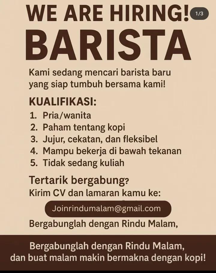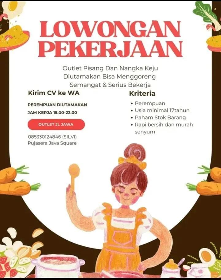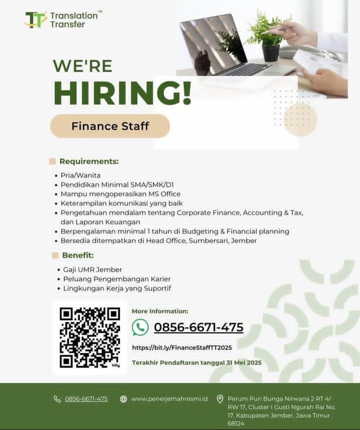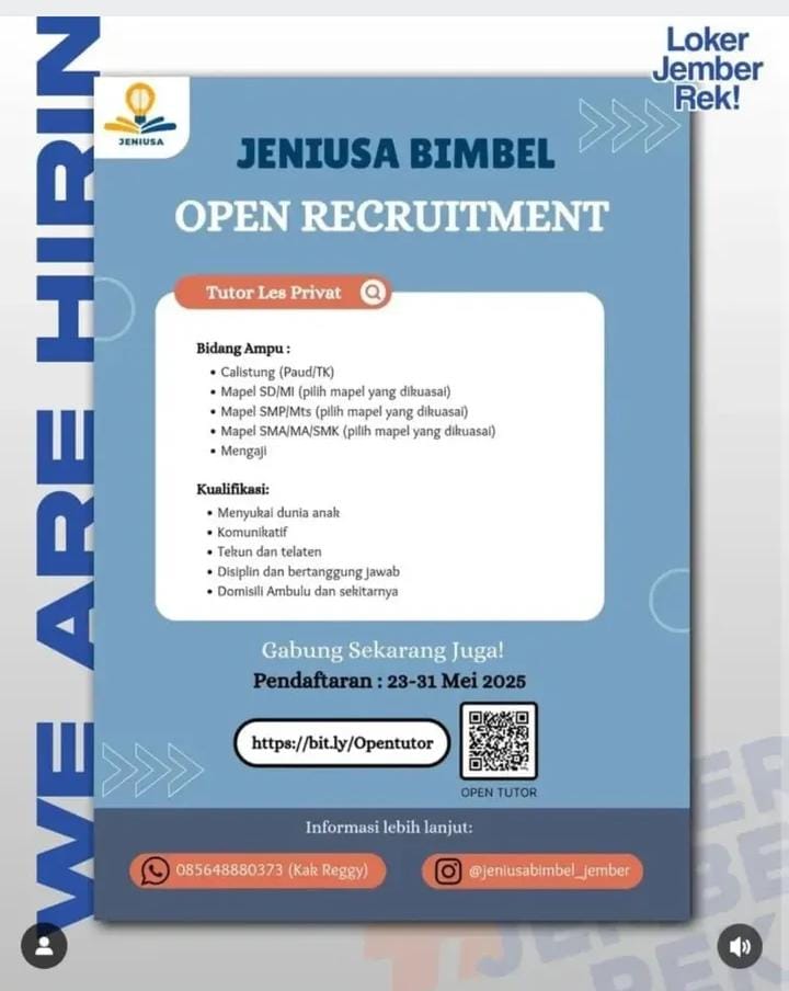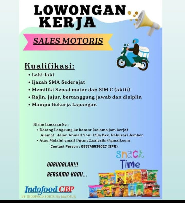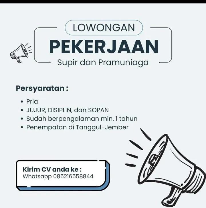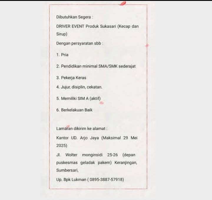 Persyaratan; Pria Pendidikan minimal SMA/SMK sederajat Pekerja keras Jujur, disiplin dan cekatan Memiliki SIM A aktif Berkelakuan baik Lamaran dikirik ke alamat; Kantor UD. Arjo Jaya (Maksimal 29 Mei 2025) Jl. Wolter Monginsidi 25-26 (depan puskesmas geladak pakem) Keranjingan Sumbersari. Up. Bapak Lukman (0895-3887-57918)