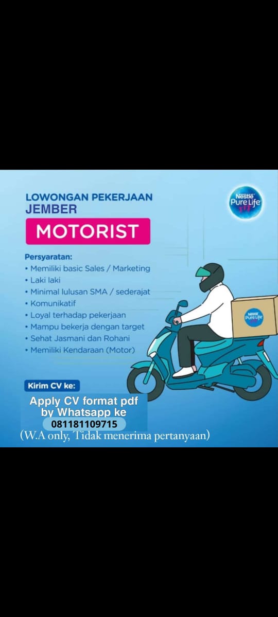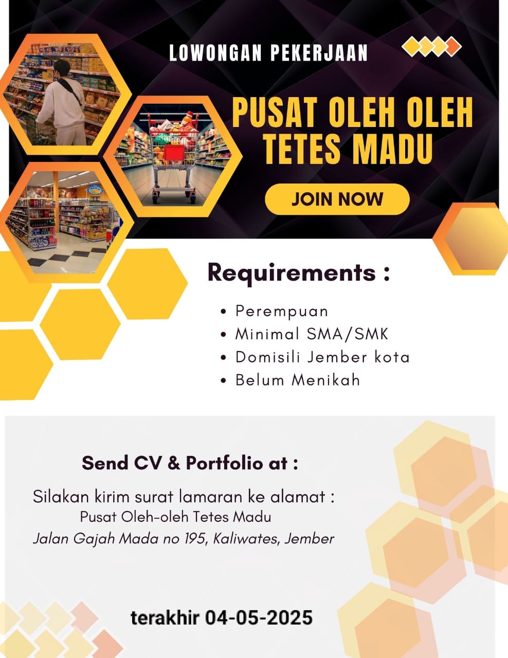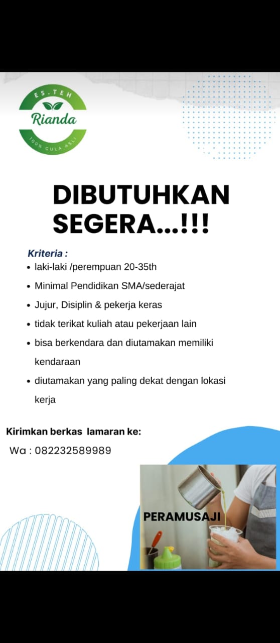 Persyaratan; Pria/Wanita Sehat jasmani dan rohani Jujur, memiliki kemauan bekerja keras Aktif dan mampu kerjasama dalam team Bersedia bekerja full time (bukan part time) Pengalaman minimal 2 tahun di bidang resto Kirim CV ke email; herdadhyaboga@gmail.com