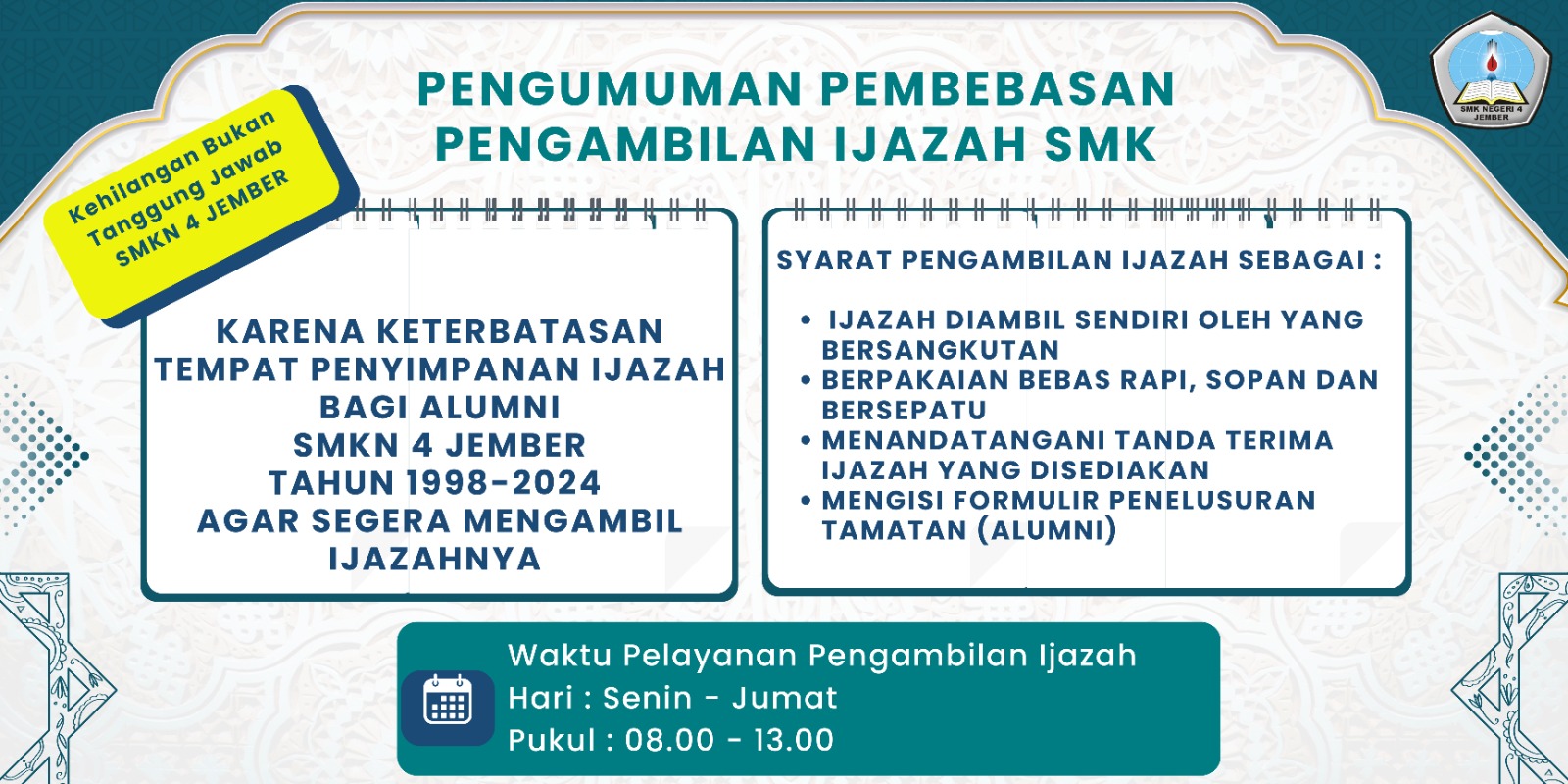 Pengumuman Pembebasan Pengambilan Ijazah SMK Karena keterbatasan tempat penyimpanan ijazah bagi alumni SMKN 4 Jember Tahun 1998-2024 agar segera mengambil ijazahnya. Syarat pengambilan ijazah sebagai berikut; Ijazah diambil sendiri oleh yang bersangkutan Berpakaian bebas rapi, sopan dan bersepatu Menandatangani tanda terima ijazah yang disediakan Mengisi formulir penelusuran tamatan (Alumni) Waktu pelayanan pengambilan ijazah; Hari : […]