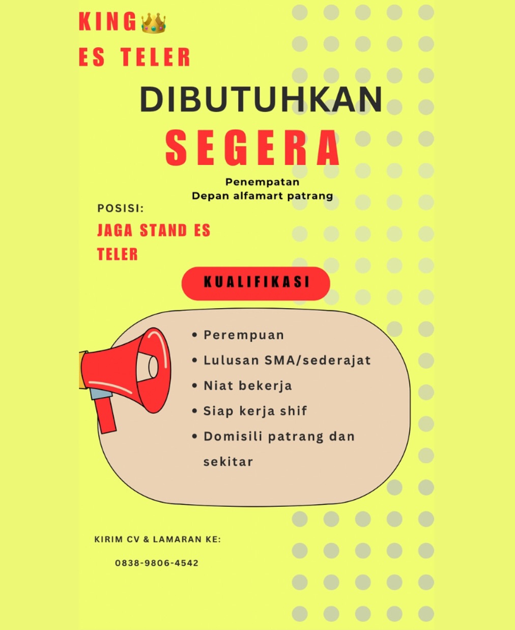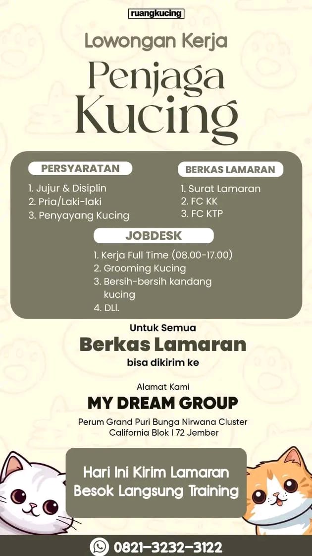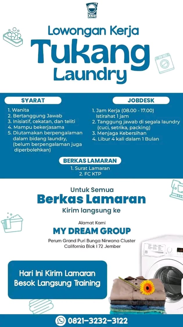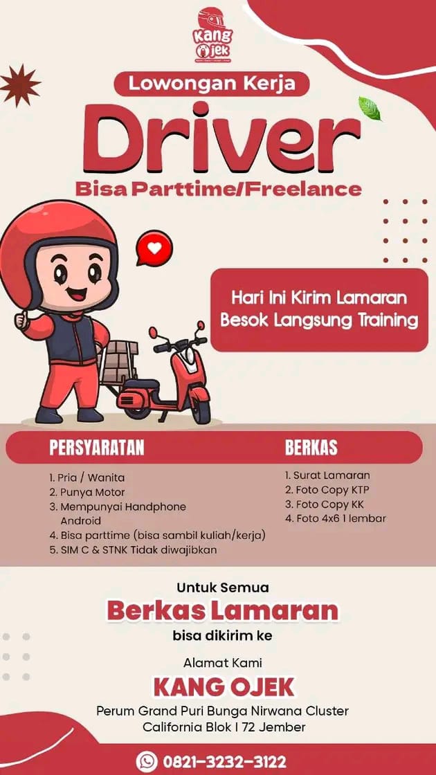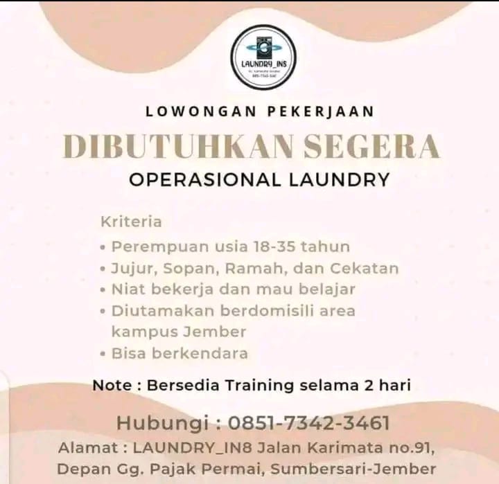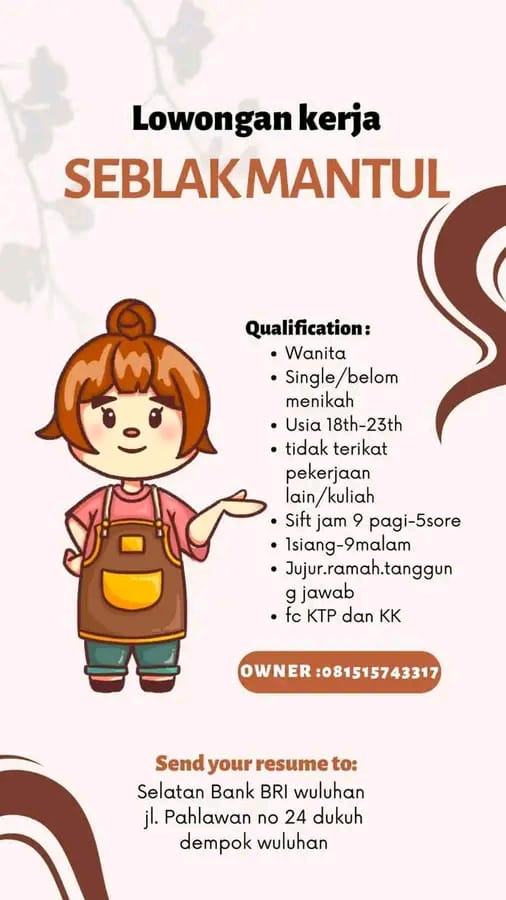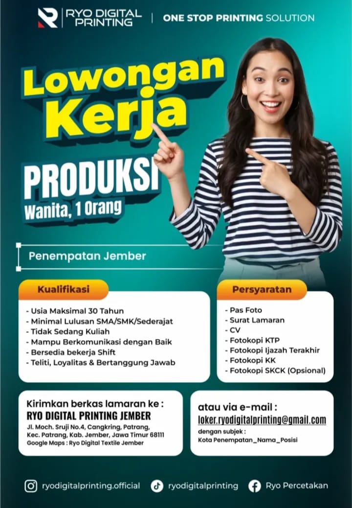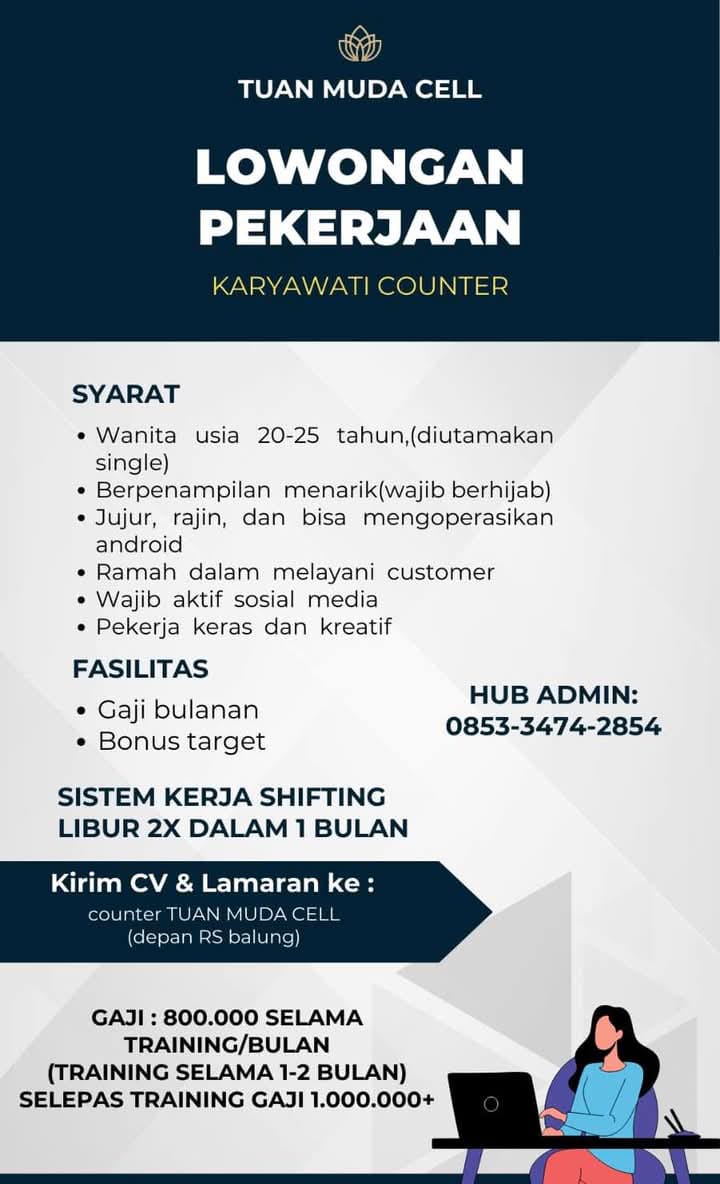 Syarat; Wanita usia 20-25 tahun (diutamakan single) Berpenampilan menarik (wajib berhijab) Jujur, rajin dan bisa mengoperasikan android Ramah dalam melayani customer Wajib aktif sosial media Pekerja keras dan kreatif Fasilitas; Gaji bulanan Bonus target Sistem kerja shifting Libur 2 kali dalam sebulan Kirim CV dan lamaran ke; counter TUAN MUDA CELL (depan RS Balung) Gaji; […]