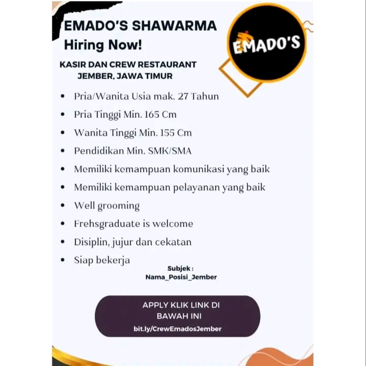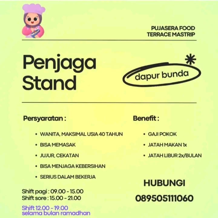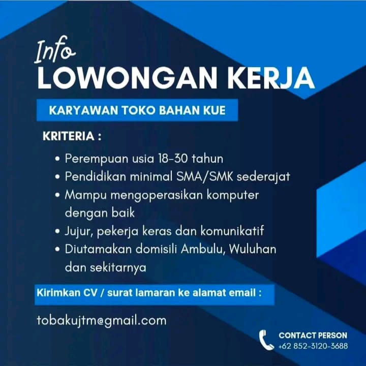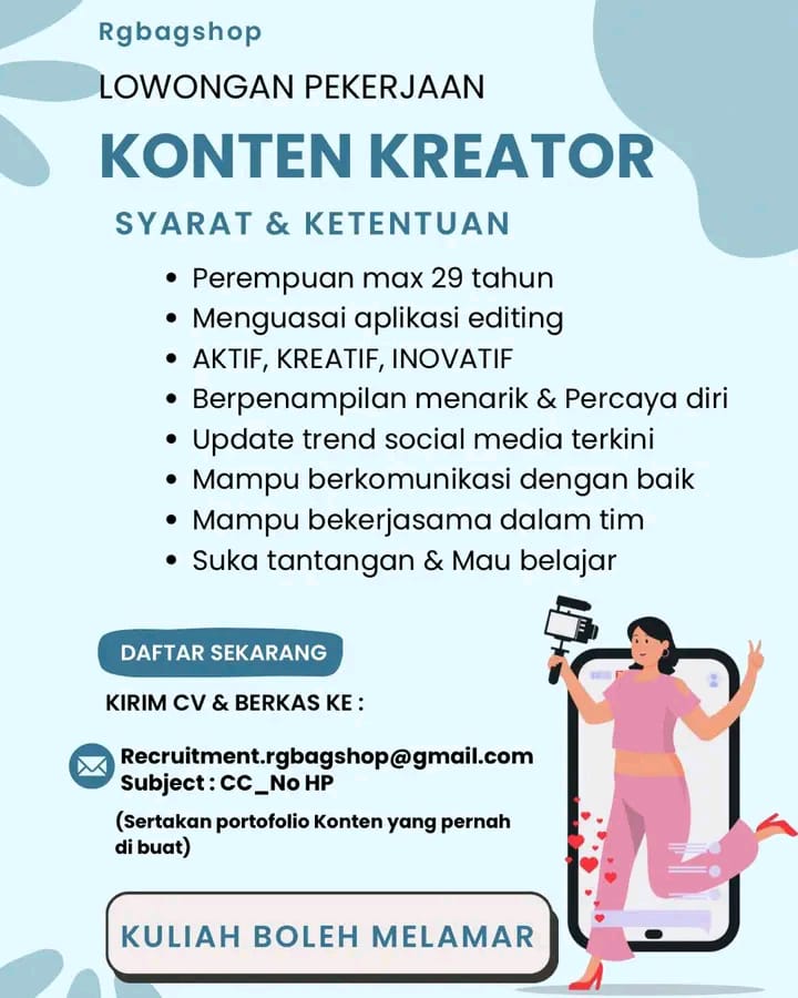Syarat dan Ketentuan Perempuan maksimal 29 tahun Menguasai aplikasi editing Aktif, Kreatif dan Inovatif Berpenamplan menarik dan percaya diri Update trend sosial media terkini Mampu berkomunikasi dengan baik Mampu bekerja sama dalam tim Suka tantangan dan mau belajar Kuliah boleh melamar Kirim CV dan berkas ke; Recruitment.rgbagshop@gmail.com Subject; CC_No HP sertakan portofolio konten yang pernah […]