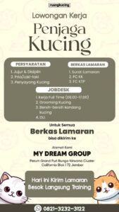 Persyaratan; Jujur dan disiplin Pria/laki-laki Penyayang kucing Berkas Lamaran; Surat lamaran FC KK FC KTP Jobdesk; Kerja full time (08.00-17.00) Grooming kucing Bersih-bersih kandang Dll Berkas lamaran kirim ke; My Dream Group Perum Grand Puri Bunga Nirwana Cluster Callifornia Blok I 72 Jember 0821-3232-3122 Hari ini kirim lamaran Besok langsung training