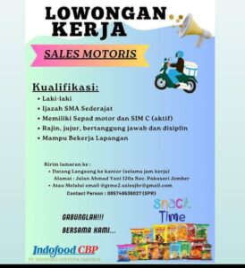 Kualifikasi; Laki-laki Ijazah SMA sederajat Memiliki sepeda motor dan SIM C (aktif) Rajin, jujur, bertanggung jawab dan disiplin Mampu bekerja lapangan Kirim lamaran ke; Datang langsung ke kantor (selama jam kerja) Alamat; Jalan Ahmad Yani 120a Kec. Pakusari Jember Melalui email; gtme2.salesjbr@gmail.com Contact Person; 085749536027 (SPR)