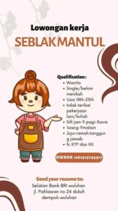 Kualifikasi; Wanita Single Usia 18-25 tahun Tidak terikat pekerjaan lain/kuliah Sift jam 9 pagi – 5 sore Sift jam 1 siang – 9 malam Jujur, ramah dan tanggung jawab FC KTP dan KK Selatan Bank BRI Wuluhan Jl. Pahlawan no 24 Dukuh Dempok Wuluhan