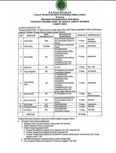 Syarat dan Kualifikasi; Beragama Islam taat dan berhalauan Ahlussunnah Wal Jama’ah Dapat membaca Al-Qur’an dengan baik Indeks Prestasi Kumulatif (IPK) Formasi Pendidikan/Guru lulusan PTN, minimal 3,00 dan PTS minimal 3,50. Formasi Tenaga Kependidikan D3/D4/S1 minimal 3,00 Formasi Tenaga Kependidikan SMA/SMK/MA lulusan sekolah negeri minimal rata-rata 7,0 dan sekolah swasta 7,50 Memiliki kemampuan mengoperasikan komputer dengan […]
