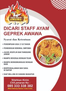 Syarat dan Ketentuan; Perempuan usia 17-22 tahun Pendidikan minimal SMP/SMA Jujur, disiplin dan tanggung jawab Mampu bekerja dengan tim Mampu berkomunikasi dengan baik Berpengalaman di dapur Siap rolling di cabang manapun Kirim CV/lamaran ke; 085 333 338 382 #niat kerja bukan coba-coba