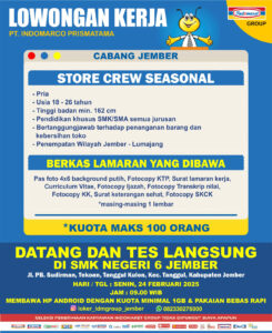 Kualifikasi; Usia 18 – 26 tahun Tinggi badan minimal 162 cm Pendidikan khusus SMK/SMA semua jurusan Bertanggungjawab terhadap penanganan barang dan kebersihan toko Penempatan wilayah Jember – Lumajang Berkas lamaran yang dibawa; Pas foto 4×6 background putih Fotocopy KTP Surat lamaran kerja Curriculum vitae Fotocopy ijazah Fotocopy transkrip nilai Fotocopy KK Surat keterangan sehat Fotocopy […]