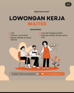 Kualifikasi; Pria Cekatan dan komunikatif Mampu bekerja di bawah tekanan Jujur dan bertanggung jawab Bersedia bekerja dengan jadwal shift Kirim lamaran dan CV ke; Joinrindumalam@gmail.com