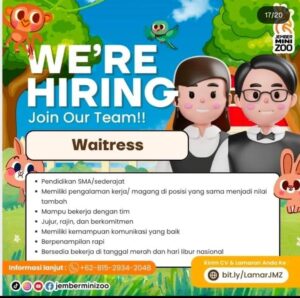 Kualifikasi; Pendidikan SMA/sederajat Memiliki pengalaman kerja/magang di posisi yang sama menjadi nilai tambah Mampu bekerja dengan tim Jujur, rajin dan berkomitmen Memiliki kemampuan komunikasi yang baik Berpenampilan rapi Bersedia bekerja di tanggal merah dan hari libur nasional Kirim CV dan lamaran anda ke; bit.ly/LamarJMZ Informasi lanjut; WA: 0815-2934-2048