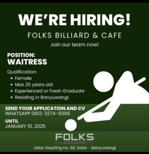 Waiterss in Folks Billiard and Cafe Quaalification; Female Max. 25 years old Experienced or fresh graduate Residing in Banyuwangi Until 10 January 2025 Send your application and CV WhatsApp 0812-3274-9399 Jalan Kepiting no. 60, Sobo-Banyuwangi