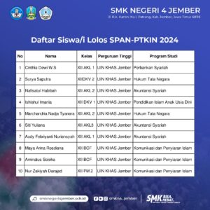Jember – 10 siswa/i SMKN 4 Jember berhasil lolos dalam SPAN PTKIN. Kabar bahagia tersebut resmi diumumkan pada 2 April 2024 kemarin. Dimana seluruh siswa/i yang lolos diterima di berbagai program studi. Tentu SMKN 4 Jember berharap, hal tersebut mampu menjadi langkah baru para pelajar #SMEPA untuk sedikit lebih dekat dengan cita-citanya.
