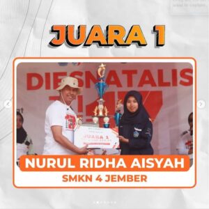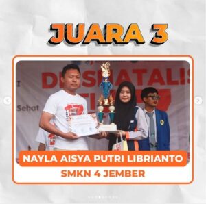 Jember – Dua Siswi SMK Negeri 4 Jember berhasil meraih prestasi gemilang dengan meraih juara pertama dalam ajang lomba desain poster dan juara ketiga dalam ajang lomba desain packaging yang diselenggarakan oleh Politeknik Negeri Jember (Hari Minggu, 1 September 2024). Ajang Lomba yang dikenal dengan EXPO dan Pekan Ilmiah Mahasiswa (EPIM) adalah kegiatan perwujudan kreativitas yang dilaksanakan perguruan tinggi Politeknik Negeri Jember, guna meningkatkan budaya kompetisi akademik dan untuk prestasi di kalangan mahasiswa, siswa dan siswi serta kalangan masyarakat. Dalam ajang lomba EPIM ini, SMK Negeri 4 Jember mengirimkan beberapa peserta Lomba.