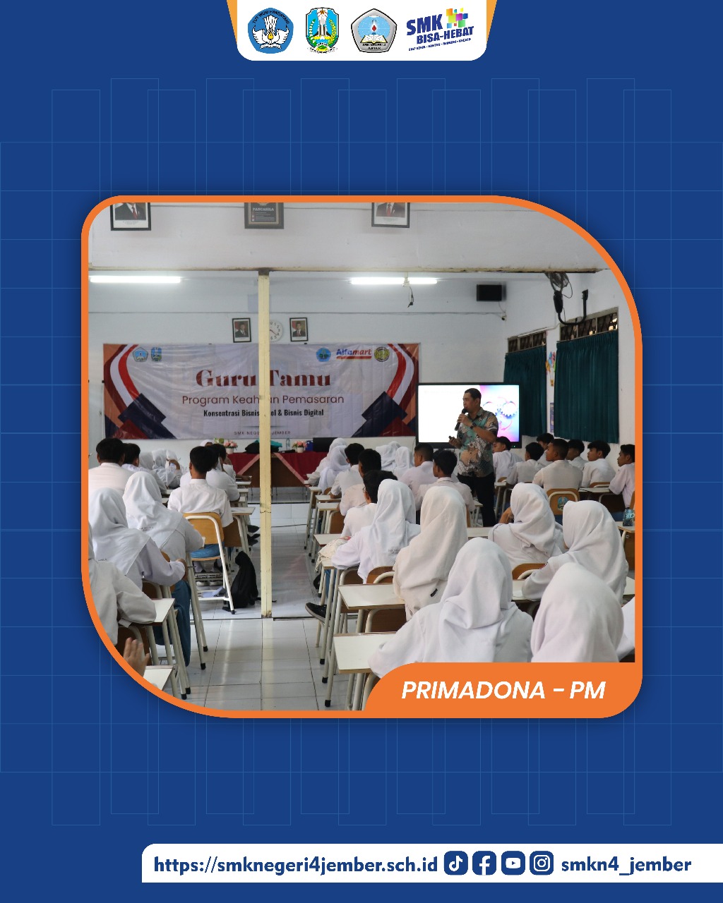 Jember – SMKN 4 Jember kembali melaksanakan Program Guru Tamu Manajemen Perkantoran dan Bisnis dengan menghadirkan mitra dunia usaha dan industri, Director Sales of Marketing Luminor Hotel, Bapak Mario Marcel. Kegiatan ini berlangsung pada Rabu, 17 September 2025, pukul 07.00 WIB di Aula sekolah. Acara diikuti oleh seluruh siswa kelas XI MPLB bersama guru pendamping […]