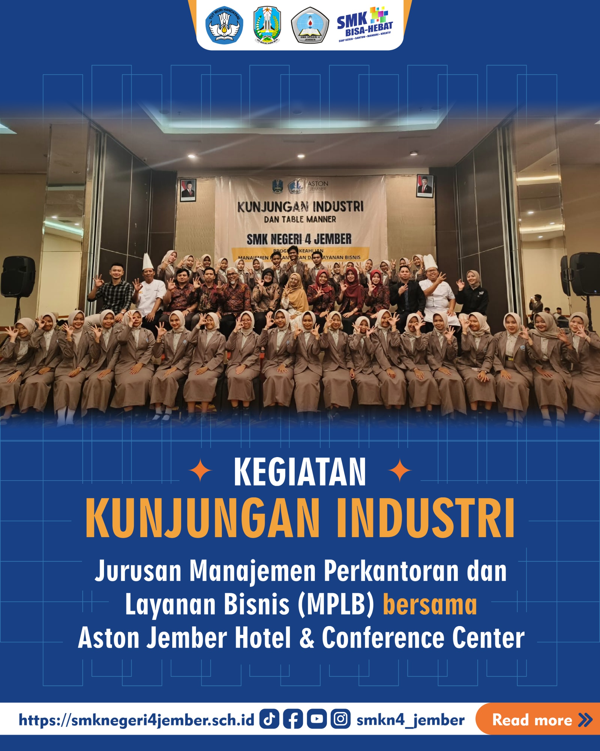 Jember – SMK Negeri 4 Jember mengadakan kunjungan industri pada hari (Sabtu, 14 Juni 2025), di Hotel Aston Jember pada pukul 07.00-15.00 WIB. Kegiatan ini bertujuan menambah wawasan luas kepada peserta didik jurusan MPLB (Manajemen Perkantoran dan Layanan Bisnis). Materi yang Siswa-siswi dapatkan dari kegiatan kunjungan industri ini antara lain: 1. Pembuatan CV Pembuatan CV […]