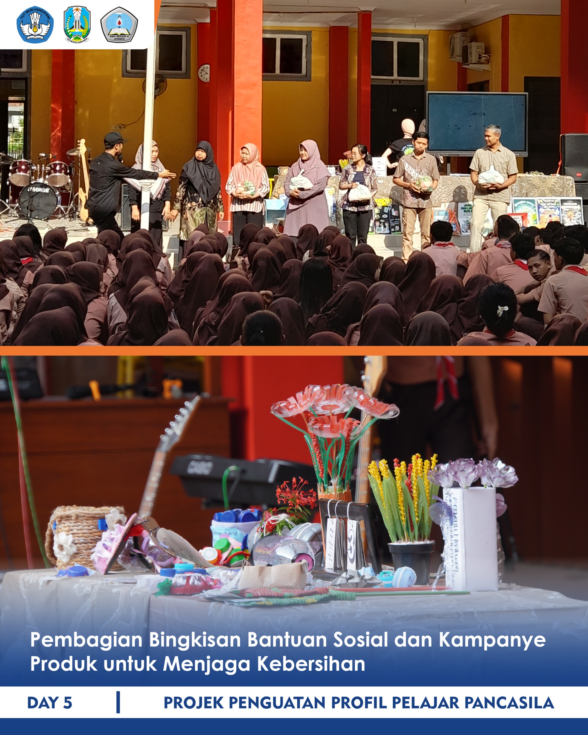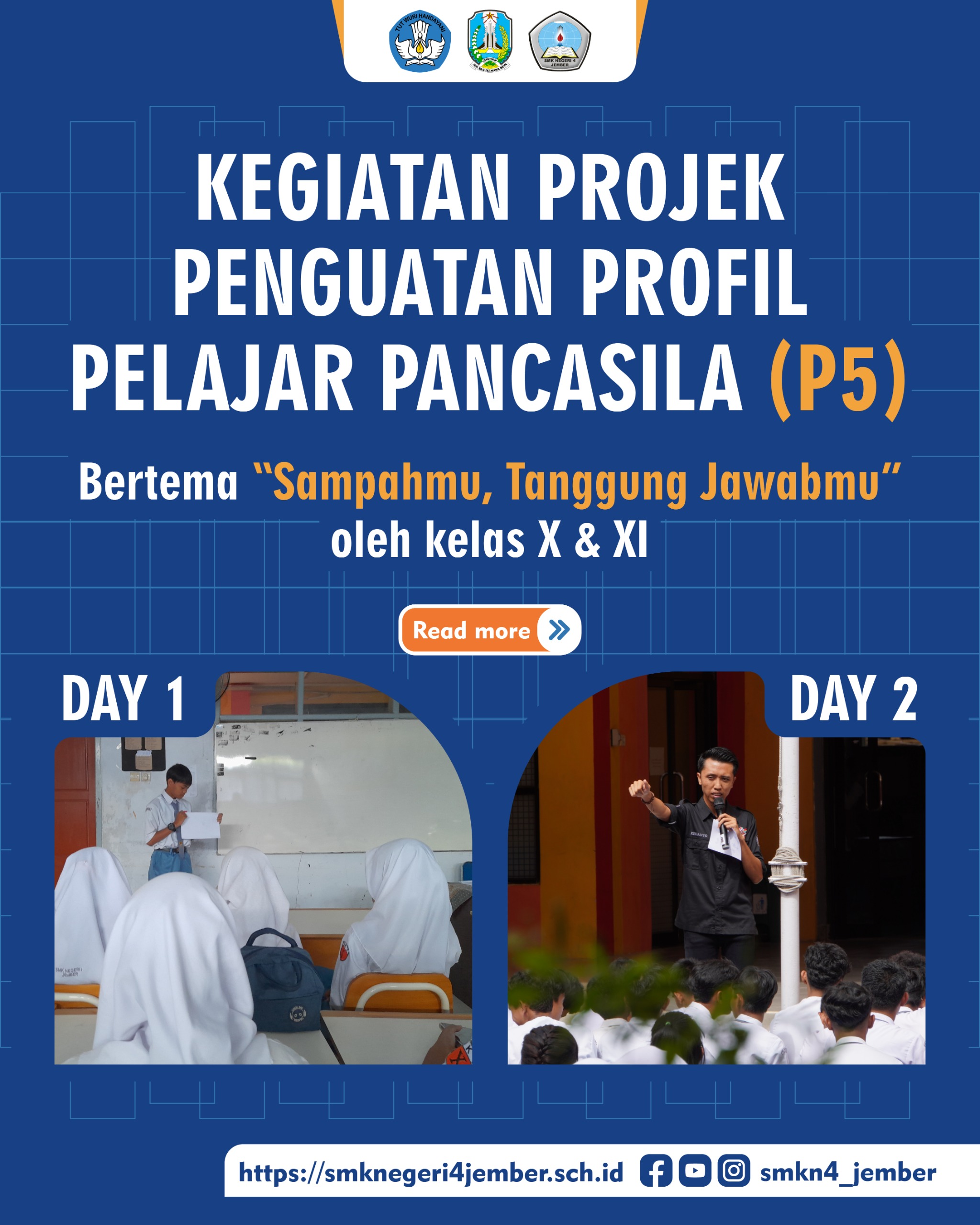 Jember – Kegiatan Projek Penguatan Profil Pelajar Pancasila (P5) di SMKN 4 Jember kembali digelar pada Senin (10/02/2025) hingga Jumat (14/02/2025). Pada hari pertama, siswa kelas X melakukan diskusi pembagian tugas dan menentukan lokasi pembersihan di Kelurahan Jember Lor. Sementara itu, kelas XI fokus pada kampanye lingkungan dengan membuat produk yang mengajak masyarakat menjaga kebersihan. […]