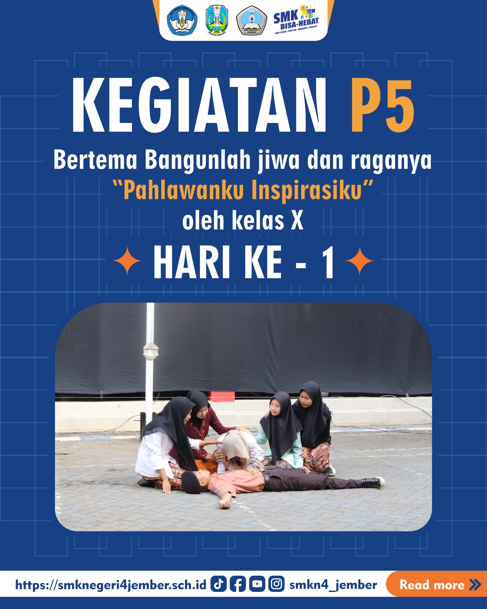 Jember — SMKN 4 Jember menggelar kegiatan P5 yang berjudul “BANGUNLAH JIWA & RAGANYA” dengan tema “Pahlawan Inspirasiku”. Peserta kegiatan P5 merupakan siswa-siswi kelas 10. Acara ini dilaksanakan selama dua hari, 29 April – 30 April 2025. Peserta membuat drama kolosal tentang sejarah perjuangan yang telah diberikan oleh fasilitator masing-masing. (2/5/2025) Hari pertama: Selasa, 29 […]