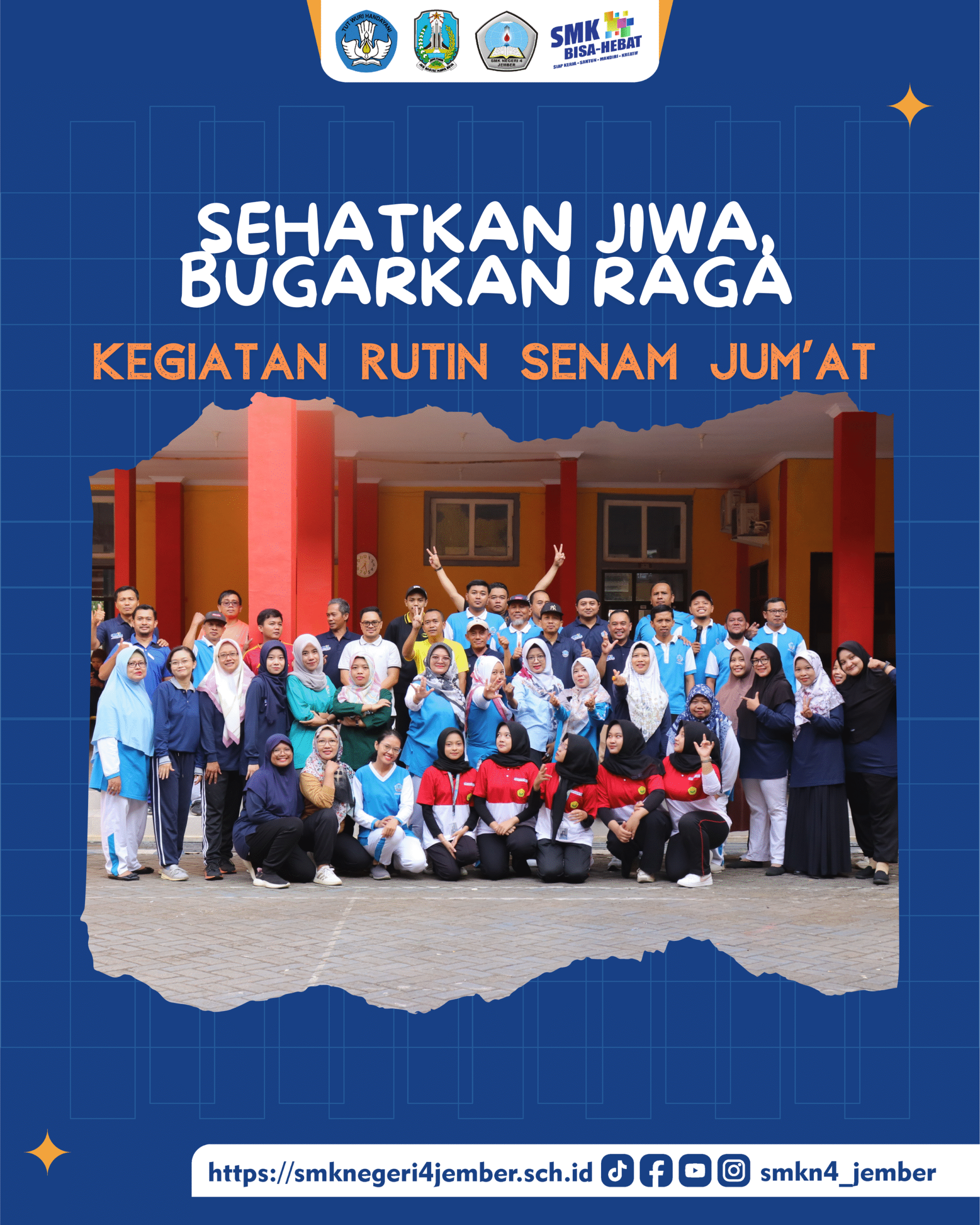Jember – Hari ini (Jum’at, 9 Mei 2025), seluruh guru dan karyawan SMKN 4 Jember hadir di sekolah lebih awal untuk berolahraga senam bersama di halaman sekolah. Kegiatan senam ini dilaksanakan secara rutin setiap hari Jum’at pada minggu ke-2 dan 3. Senam dimulai pukul 06.30 dan berakhir pukul 07.00 pagi sehingga tidak mengganggu kegiatan belajar […]